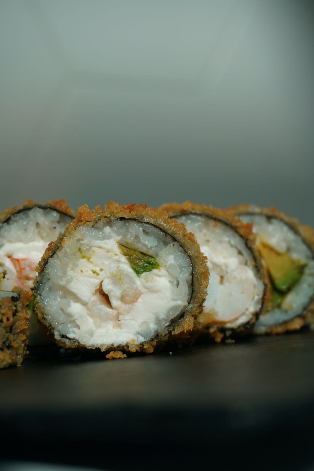 Рис, нори, творожный сыр, лосось, авокадо,сухари панко