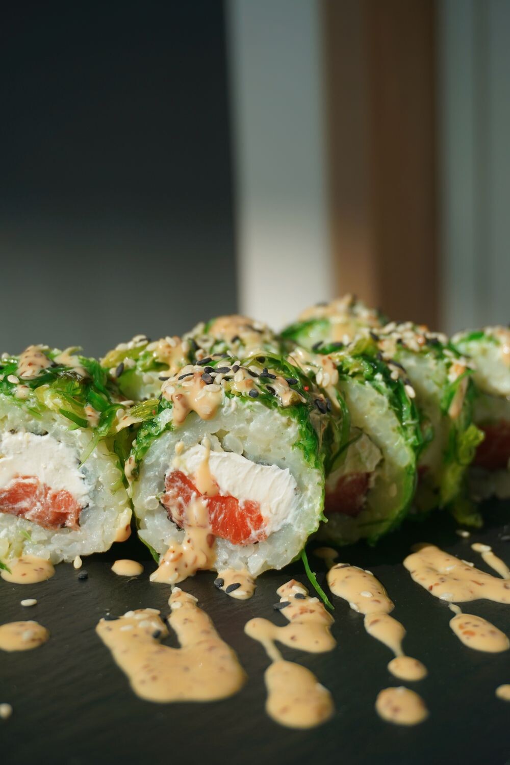 Рис, нори, сыр, лосось, чука, ореховый соус, кунжут