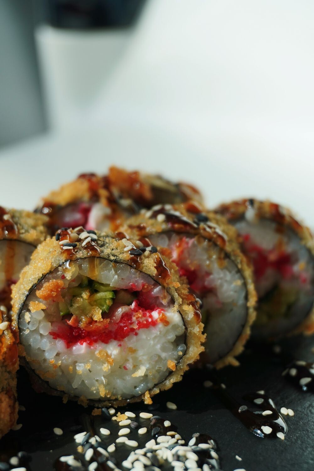 Рис, нори, сыр творожный, масаго, угорь, огурец,сухари панко, соус унаги, кунжут