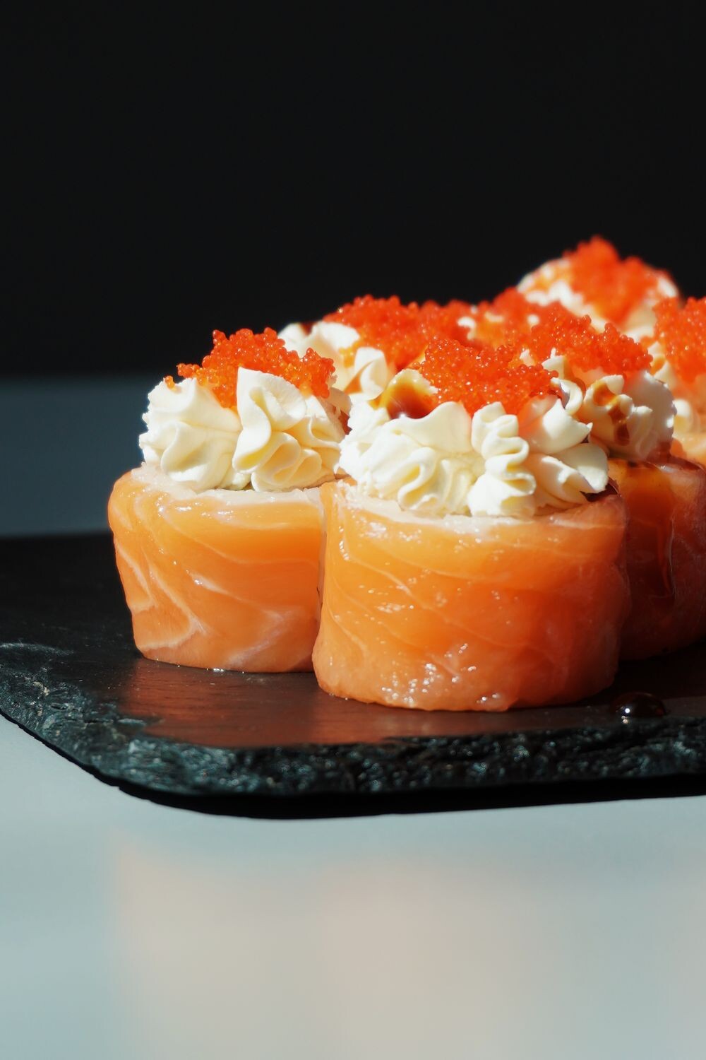 Рис, нори, лосось, авокадо, творожный сыр, масаго, соус унаги