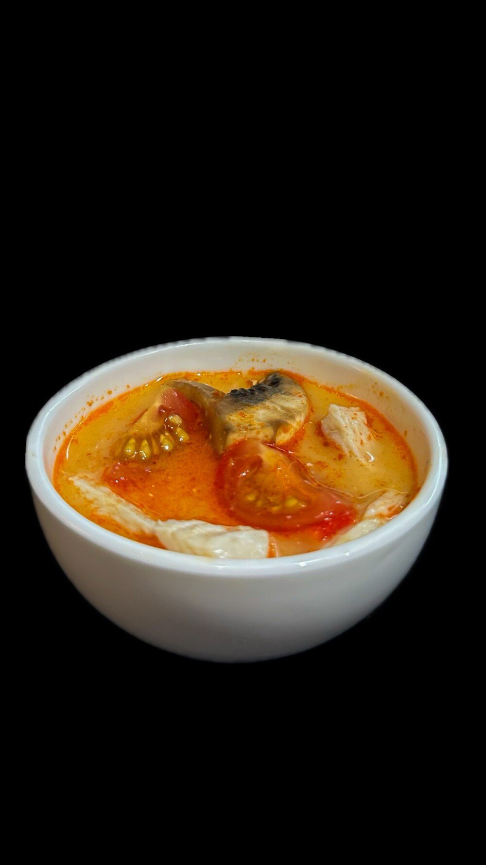 Цыпленок, шампиньоны, бульон «Том ям», помидоры «Черри», сливки